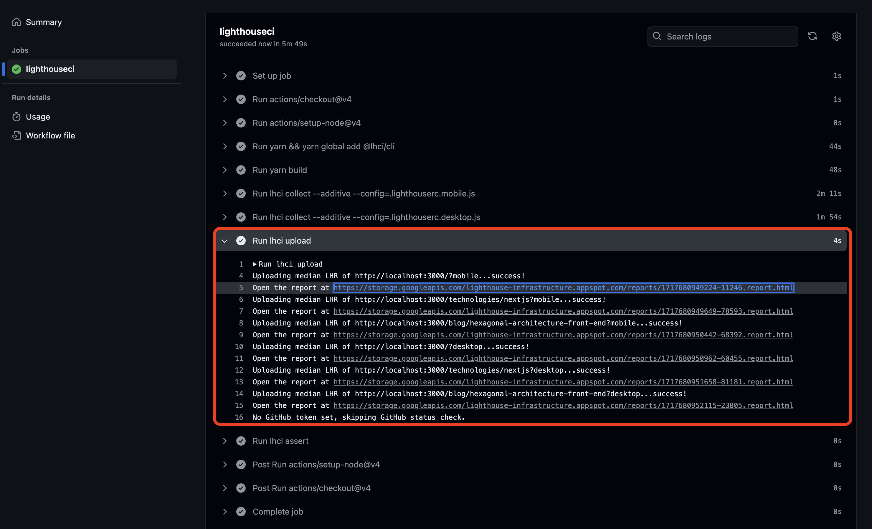 Chaque rapport d'audit est stocké dans le cloud de Google. Vous pouvez consulter les rapports en cliquant sur chaque lien de l'étape Run lhci upload de la Github Action.